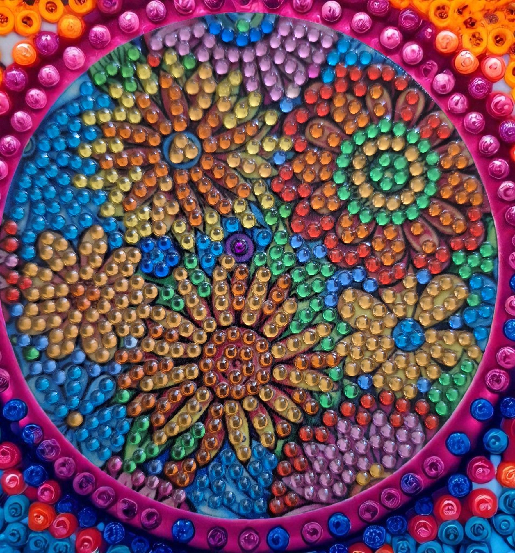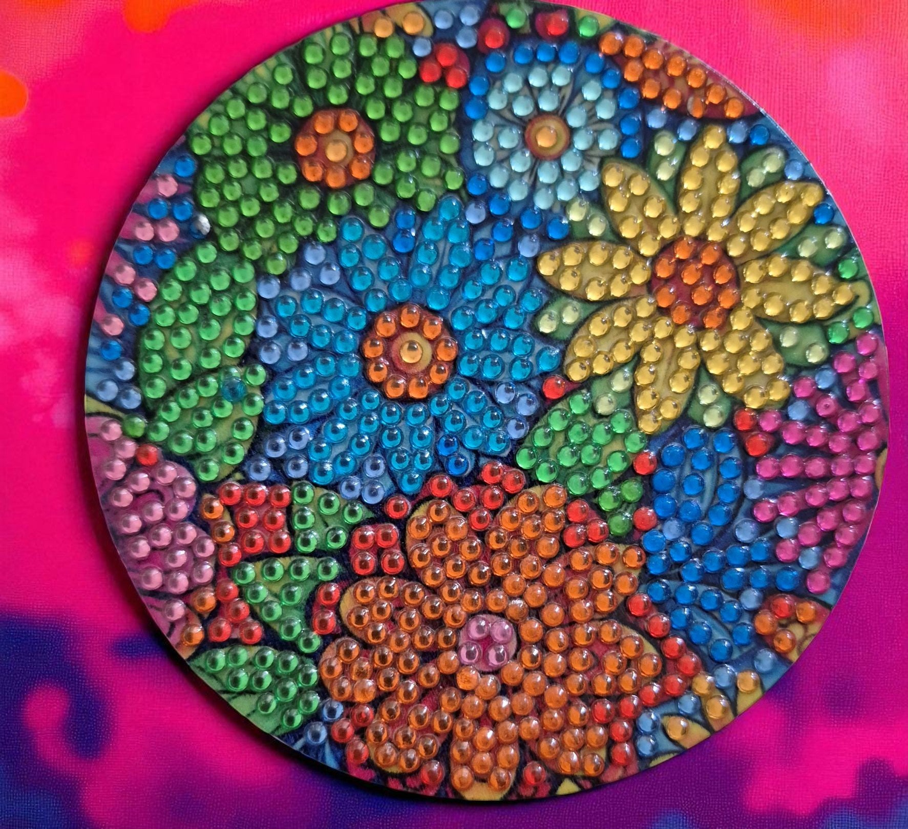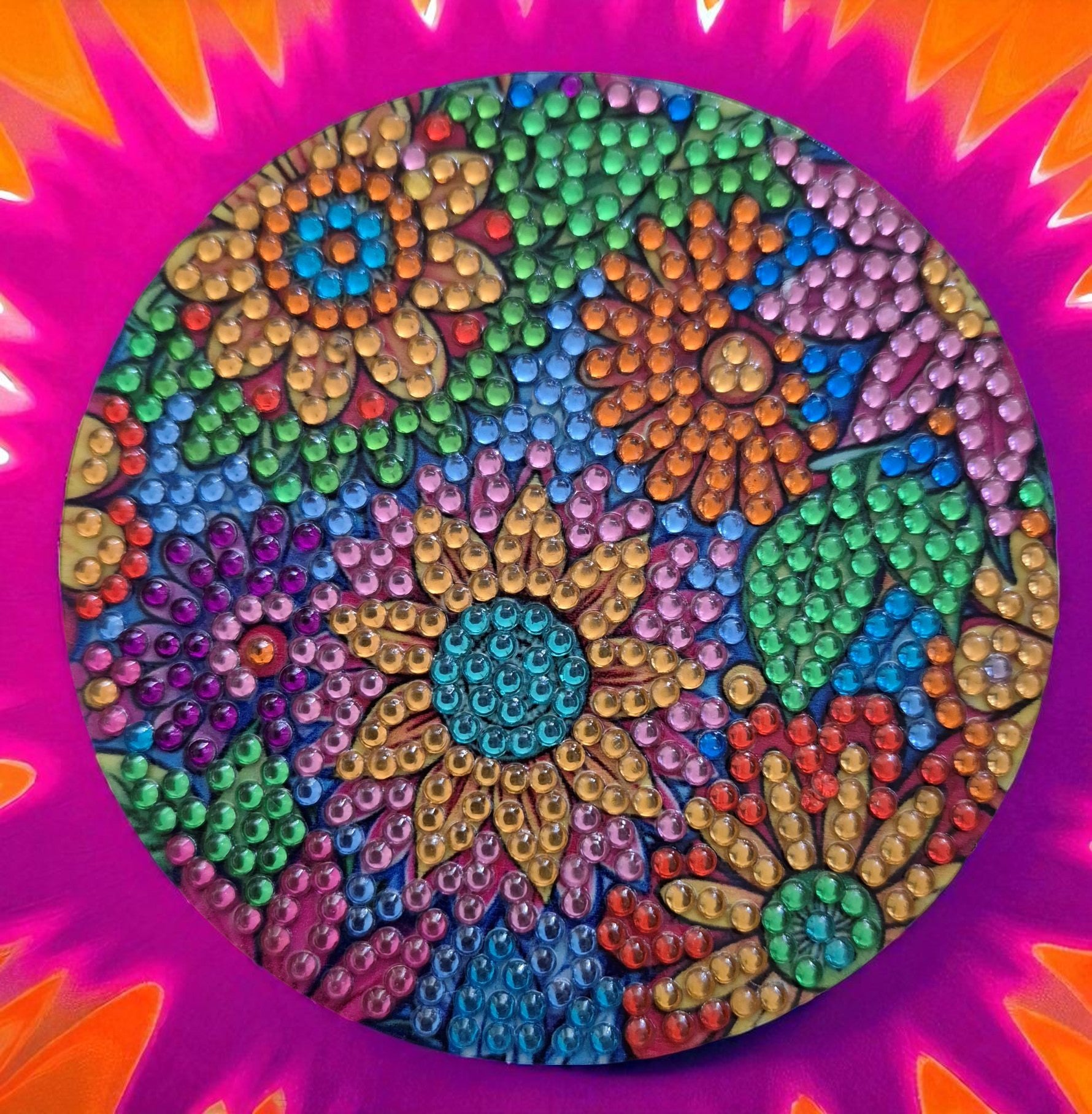 Protect your furniture in style with our set of 8 coasters featuring vibrant hippie flowers. Each coaster is a unique piece of art created with diamond painting techniques. Perfect for entertaining, this set comes with a stylish coaster keeper. Give the gift of functional beauty with these coasters, or add a splash of the 60's to your special room.