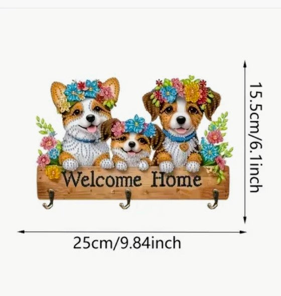Three adorable pups are here to greet you every time you walk through the door. This charming “Welcome Home” diamond painted hat and key rack features a trio of bright-eyed, flower-crowned puppies perched above a rustic wooden sign. A heartwarming blend of décor and function.