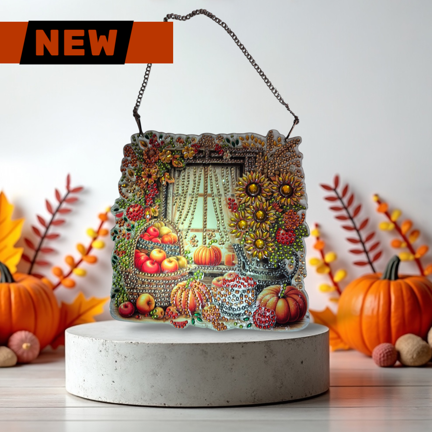 This beautiful fall themed Sun Catcher is adorned with sparkling, handmade, diamond painted pumpkins, apples and flowers. You can brighten any room with fall decor or for the holidays. Hang in any window or on your wall using the included chain. Also, this would make a unique gift for anyone who loves the fall season.