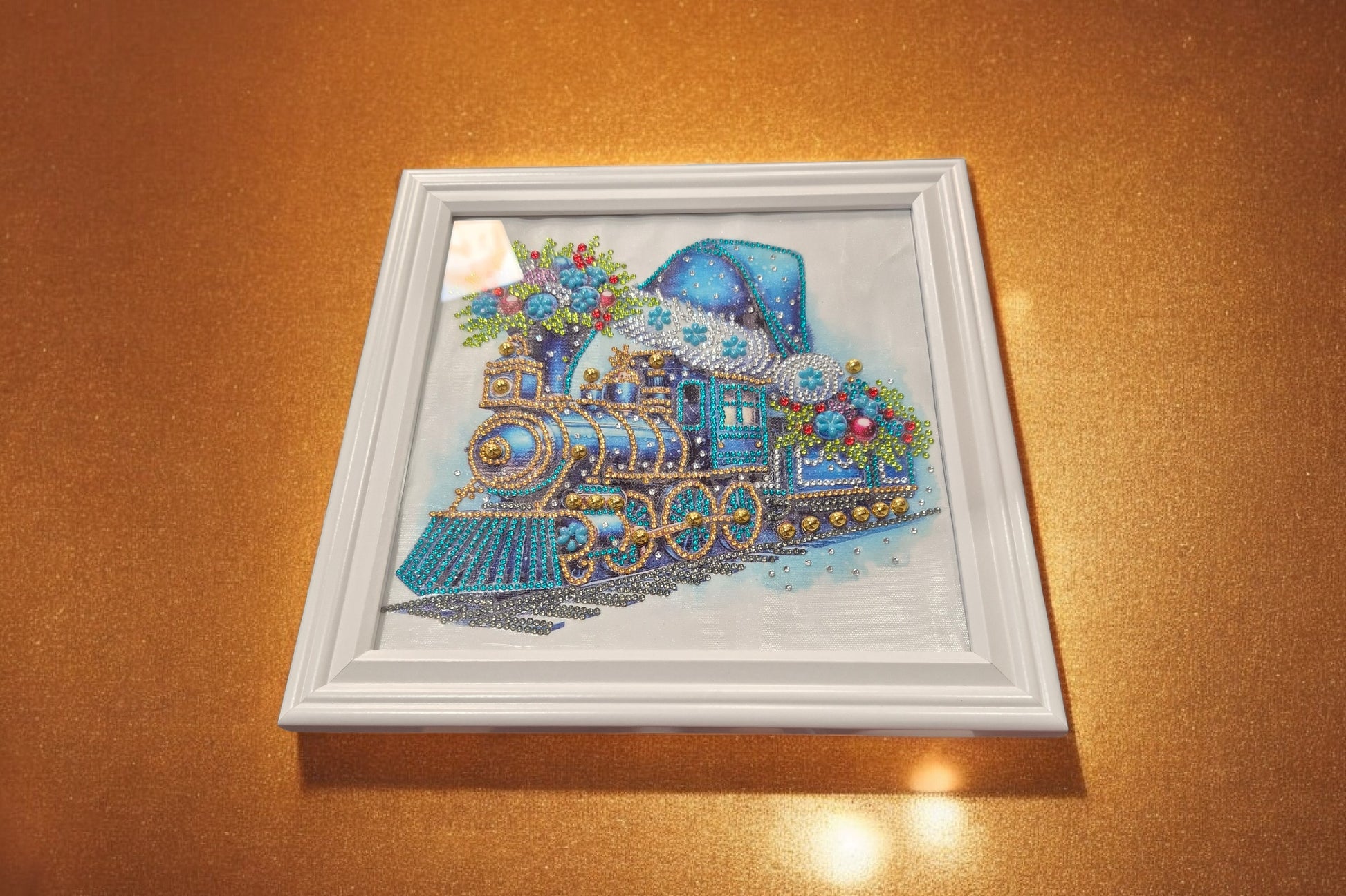 All aboard the sparkle train. Add a festive sparkle to your home with this stunning Handmade Diamond Painting of a Holiday Train! Meticulously crafted with vibrant rhinestones and shimmering gems, this unique artwork features a whimsical blue train adorned with holiday garlands, snow-topped details, and colorful ornaments.